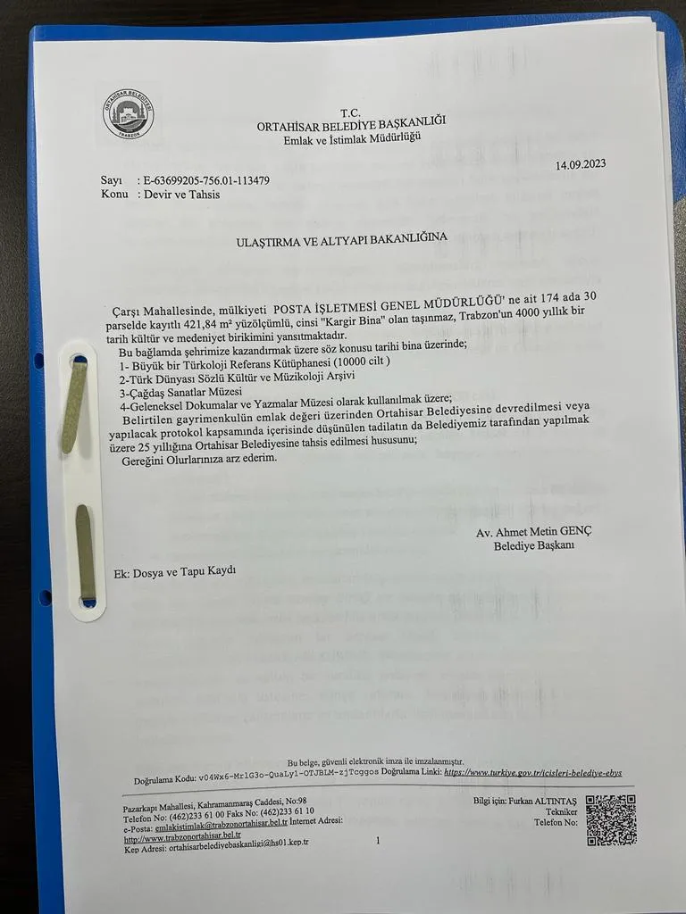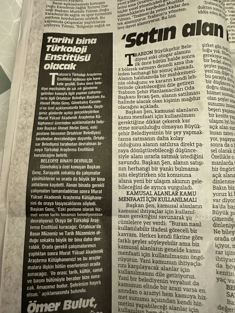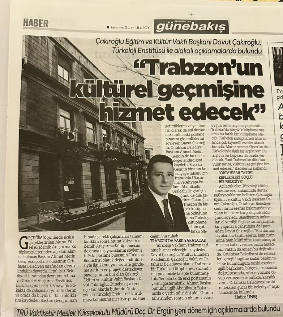 Trabzon Büyükşehir Belediyesi Meclis üyesi ve aynı zamanda Vakfımızın Başkan Yardımcısı Davut Çakıroğlu’nun girişimleriyle Trabzon’a yeni bir hizmet daha kazandırmak için yapılan çalışmayla ilgili olarak Davut Çakıroğlu Günebakış gazetesine yaptığı açıklamada “Trabzon’da Türkoloji Enstitüsü kurulması konusunu Meclis gündemine getirdiklerini ve yer önerisi olarak da atıl durumdaki eski postane binasını gösterdiklerini söyleyen Davut Çakıroğlu, Ortahisar belediye başkanı Ahmet Metin Genç’in de bu talebi değerlendirdiğini kaydetti. Ortahisar Belediyesinin Bakanlıktan gerekli izinleri aldığını, Belediyenin tarihi eserlerle ilgili yapılacak çalışmalar hususunda hassas olduğunu ve destek verdiğini, yapılacak Enstitü ve Kütüphaneye Çakıroğlu Eğitim ve Kültür Vakfı olarak her türlü desteği vereceklerini beyan etti.” Aşağıda detayları verilen çalışmanın ön aşaması bitmiş olup uygulama aşamasına geçilecektir.
