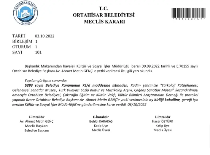 Trabzon İli Ortahisar Belediyesi Meclis’inin 03/10/2022 tarihli, 1. birleşim, 1.oturumunda alınan 101 sayılı kararı ile “5393 sayılı Belediye Kanununun 75/d maddesine istinaden, Kadim Şehrimize “Türkoloji Kütüphanesi, Geleneksel Sanatlar Müzesi, Türk Dünyası Sözlü Kültür ve Müzikoloji Arşivi, Çağdaş Sanatlar müzesi” kazandırılması amacıyla Ortahisar Belediyesi, Çakıroğlu Eğitim ve Kültür Vakfı, Kültür Bilimleri Araştırmaları Derneği ile protokol yapmak üzere Ortahisar Belediye Başkanı Av.Ahmet Metin GENÇ’e yetki verilmesinin oy birliği ile kabulüne, gereği için evrakın Kültür ve Sosyal İşler Müdürlüğü’ne gönderilmesine karar verildi. 03/10/2022”