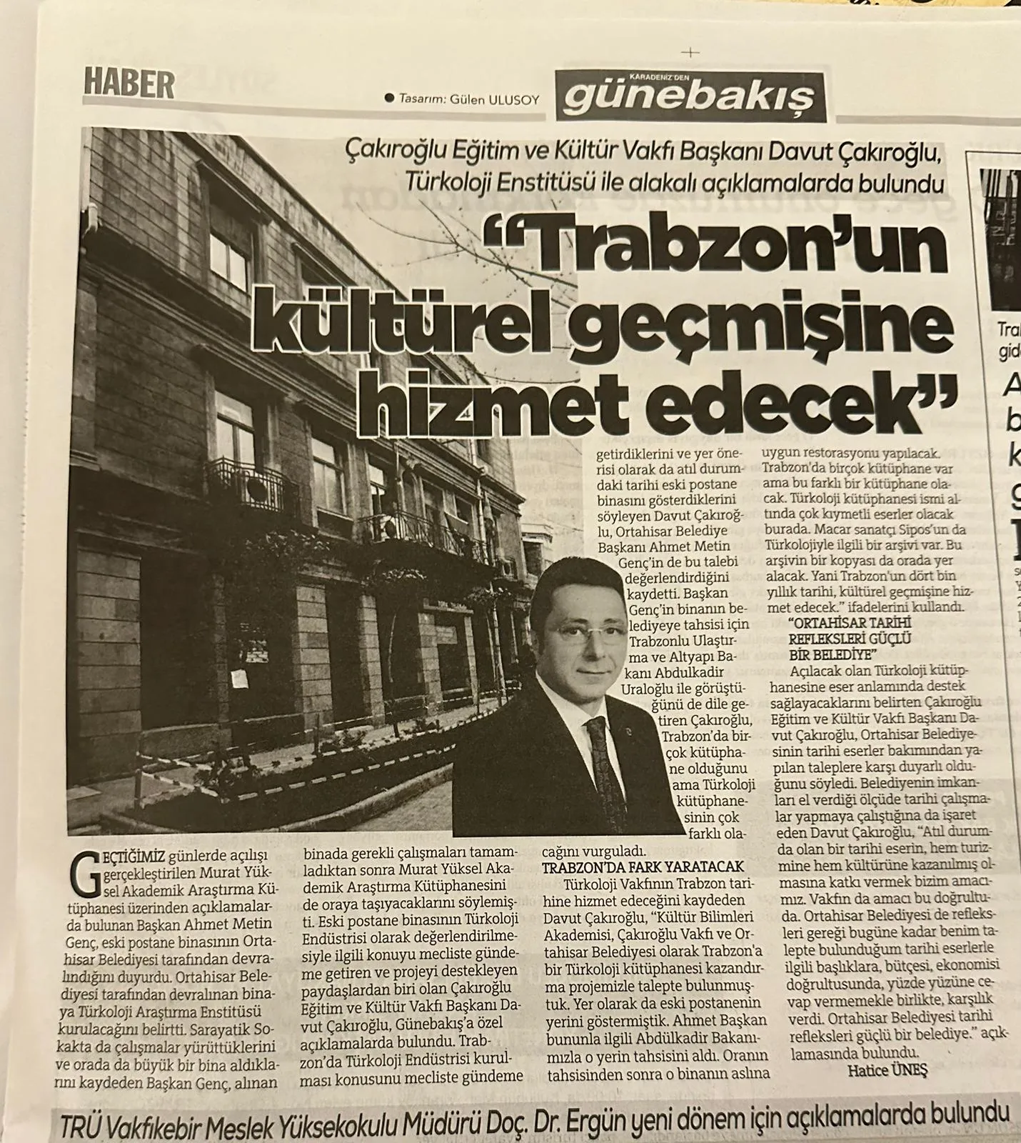 Trabzon Büyükşehir Belediyesi Meclis üyesi ve aynı zamanda Vakfımızın Başkan Yardımcısı Davut Çakıroğlu’nun girişimleriyle Trabzon’a yeni bir hizmet daha kazandırmak için yapılan çalışmayla ilgili olarak Davut Çakıroğlu Günebakış gazetesine yaptığı açıklamada “Trabzon’da Türkoloji Enstitüsü kurulması konusunu Meclis gündemine getirdiklerini ve yer önerisi olarak da atıl durumdaki eski postane binasını gösterdiklerini söyleyen Davut Çakıroğlu, Ortahisar belediye başkanı Ahmet Metin Genç’in de bu talebi değerlendirdiğini kaydetti. Ortahisar Belediyesinin Bakanlıktan gerekli izinleri aldığını, Belediyenin tarihi eserlerle ilgili yapılacak çalışmalar hususunda hassas olduğunu ve destek verdiğini, yapılacak Enstitü ve Kütüphaneye Çakıroğlu Eğitim ve Kültür Vakfı olarak her türlü desteği vereceklerini beyan etti.” Aşağıda detayları verilen çalışmanın ön aşaması bitmiş olup uygulama aşamasına geçilecektir.